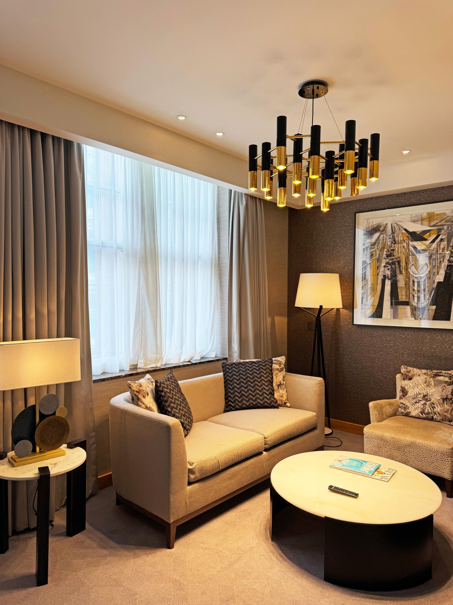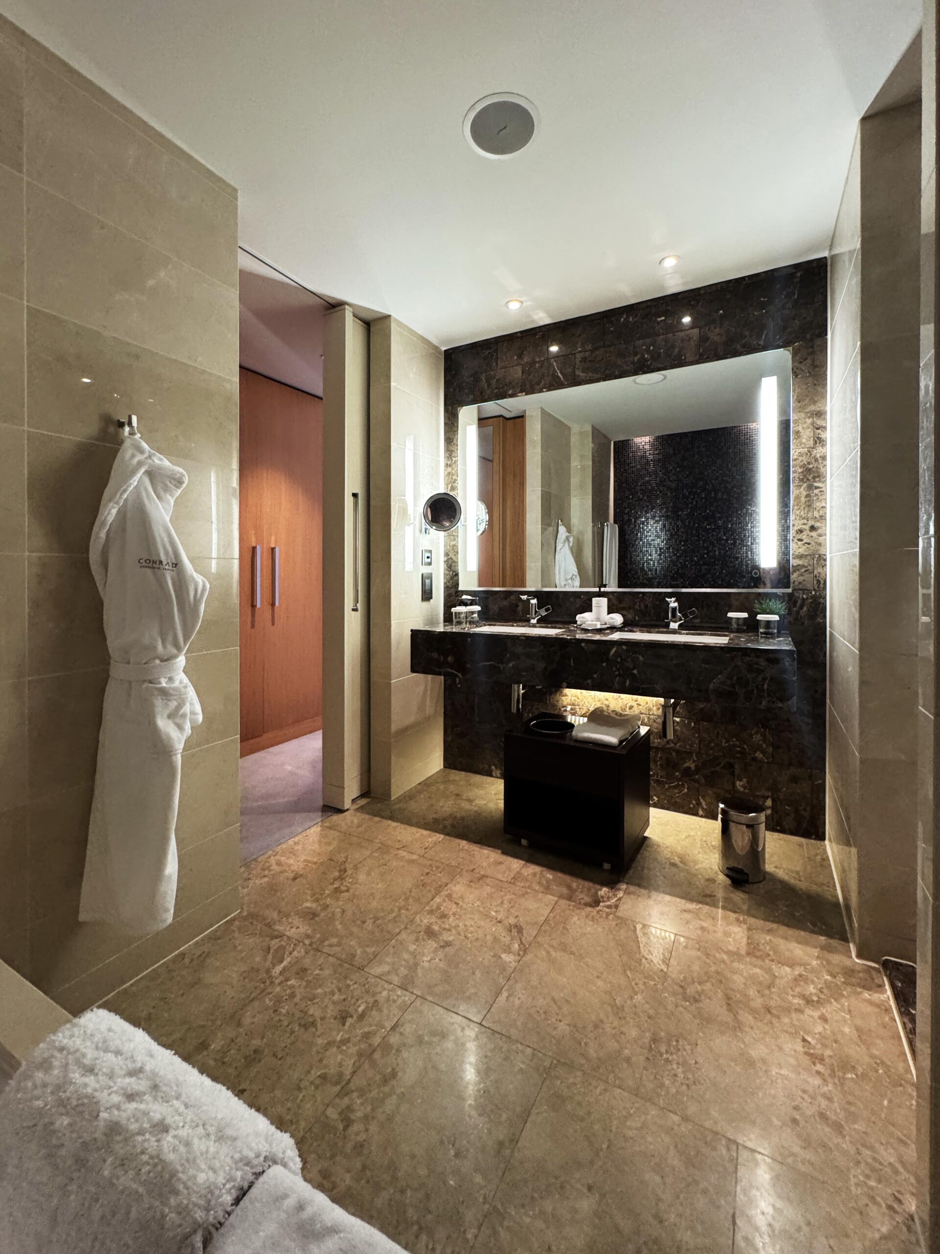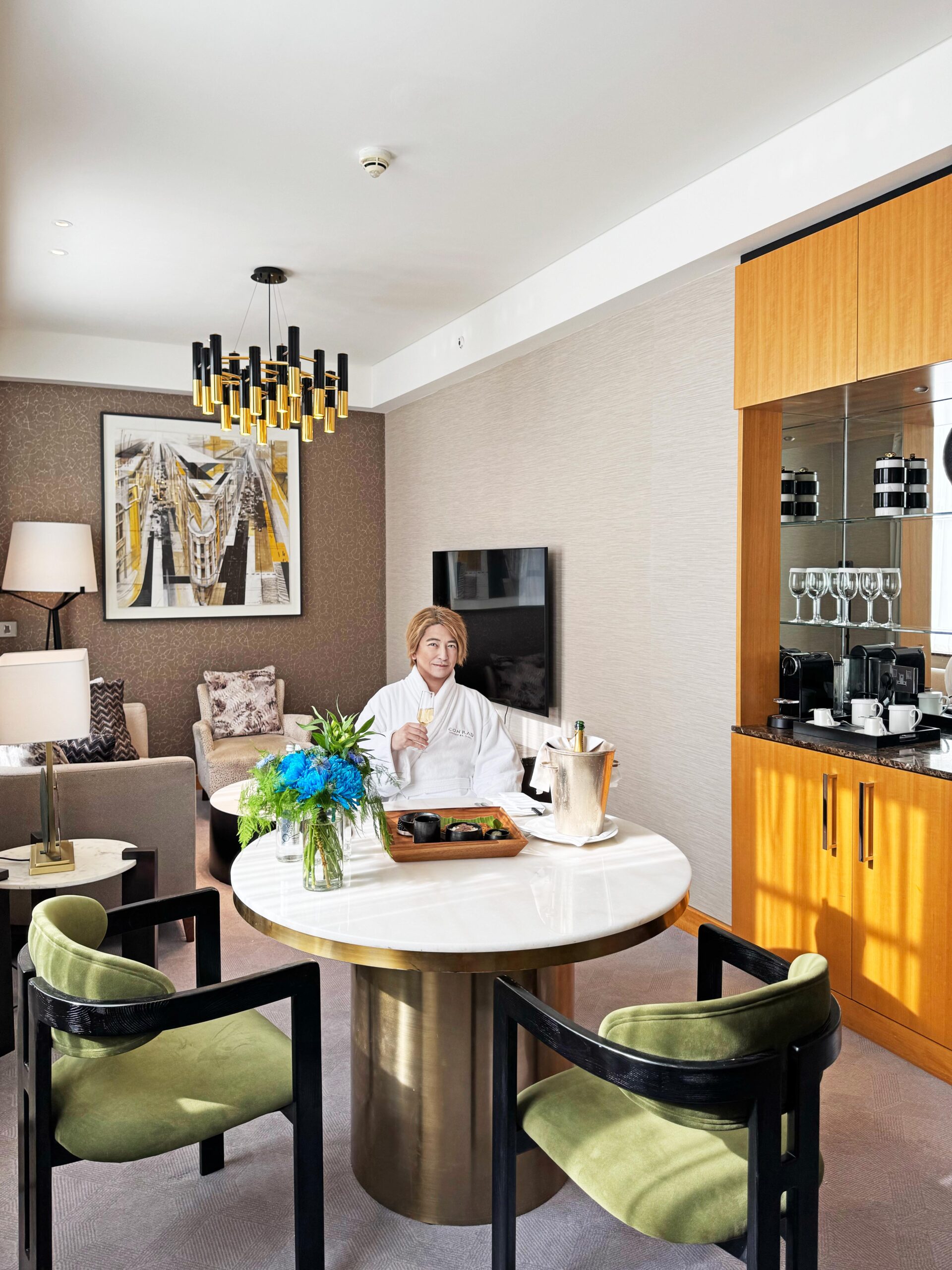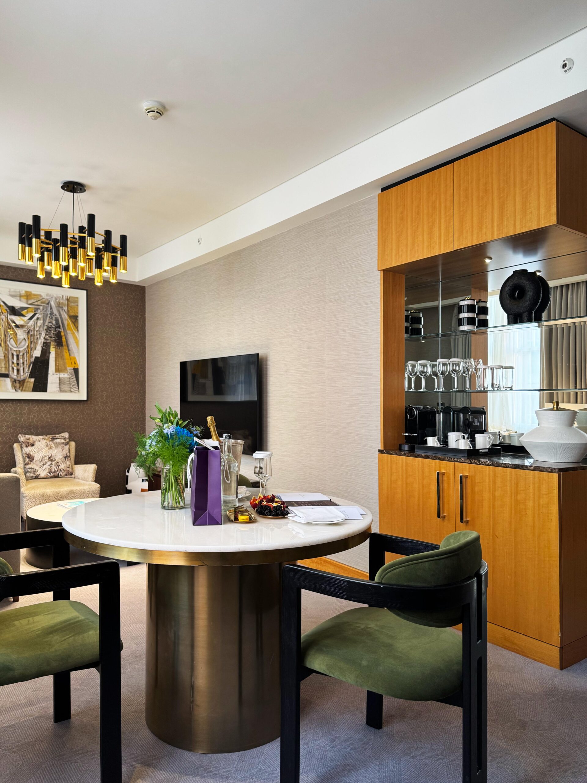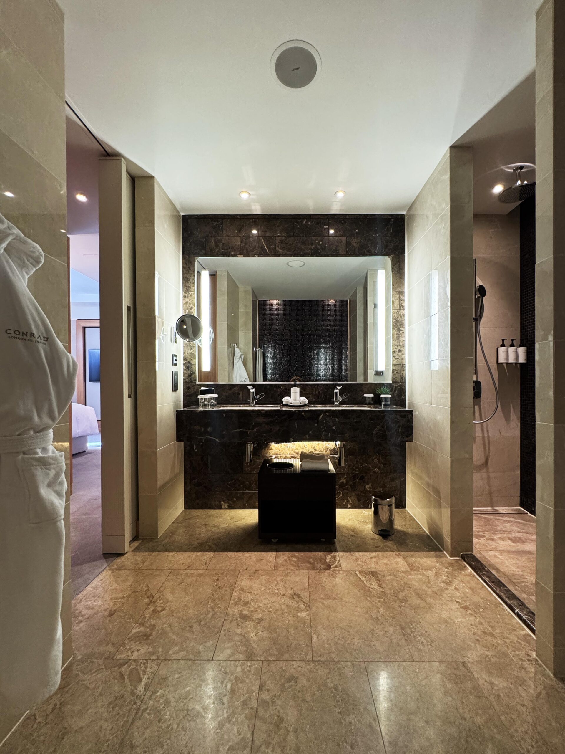 Celebrating The King’s official birthday was truly special from the luxurious comfort of Conrad London St. James! My stay in the One Bedroom Deluxe Suite with Lounge Access was pure indulgence. This unique 58 sq. m. suite offered stylish accommodations with a separate lounge and dining area, perfect for entertaining. The large master bathroom, featuring elegant mosaic-style, double vanity, a spacious rain shower, and a large bathtub, was exceptional.