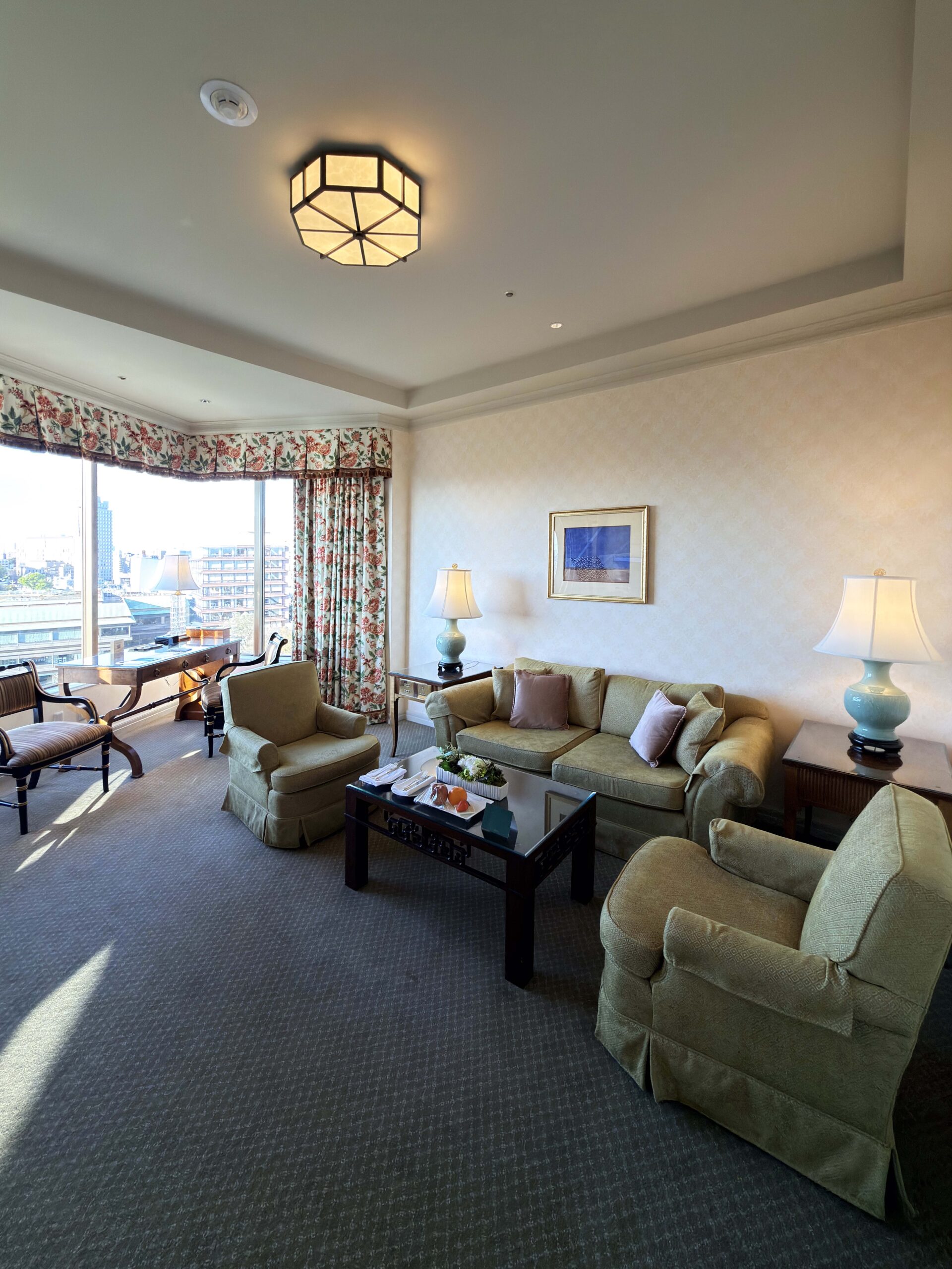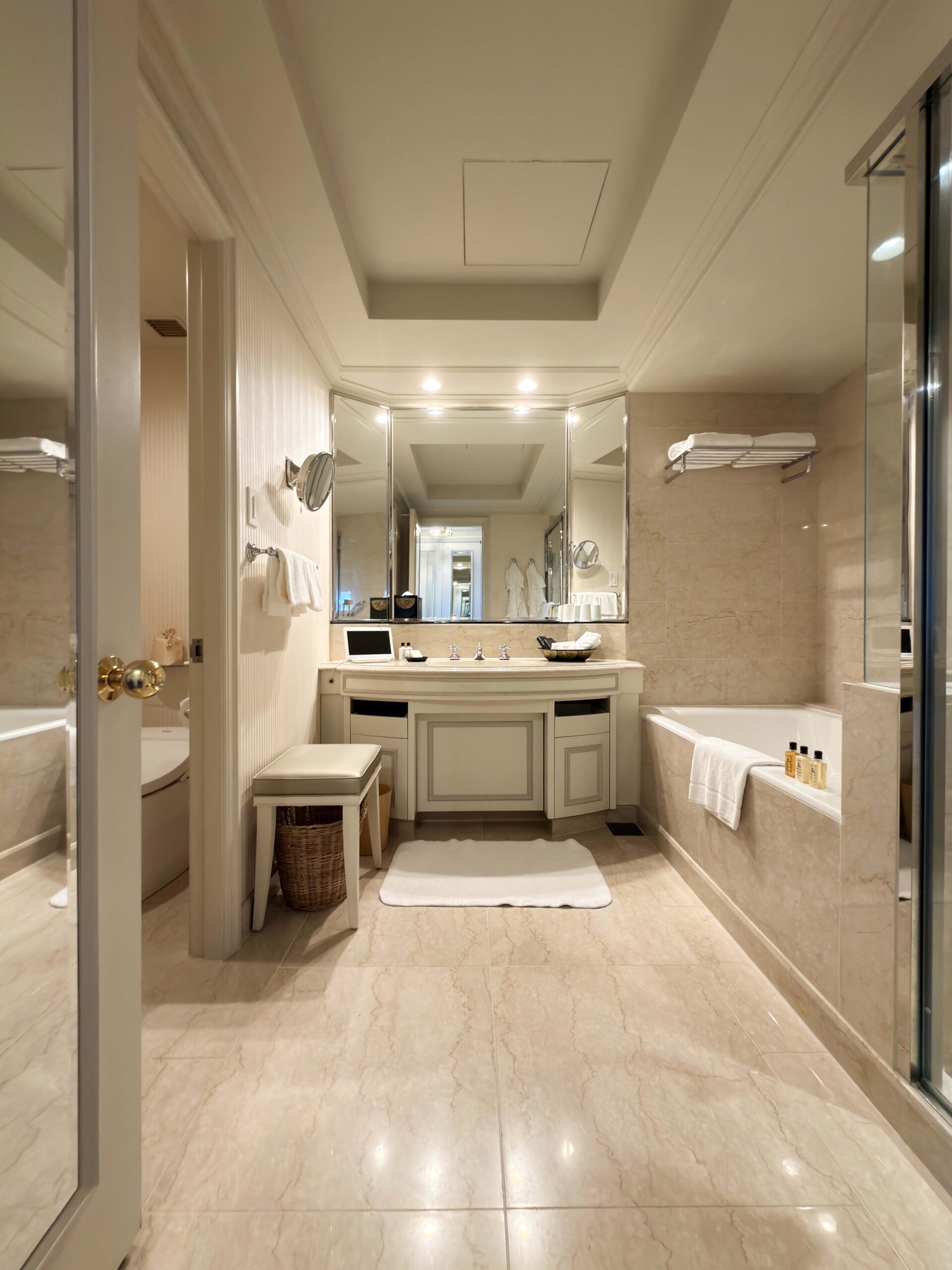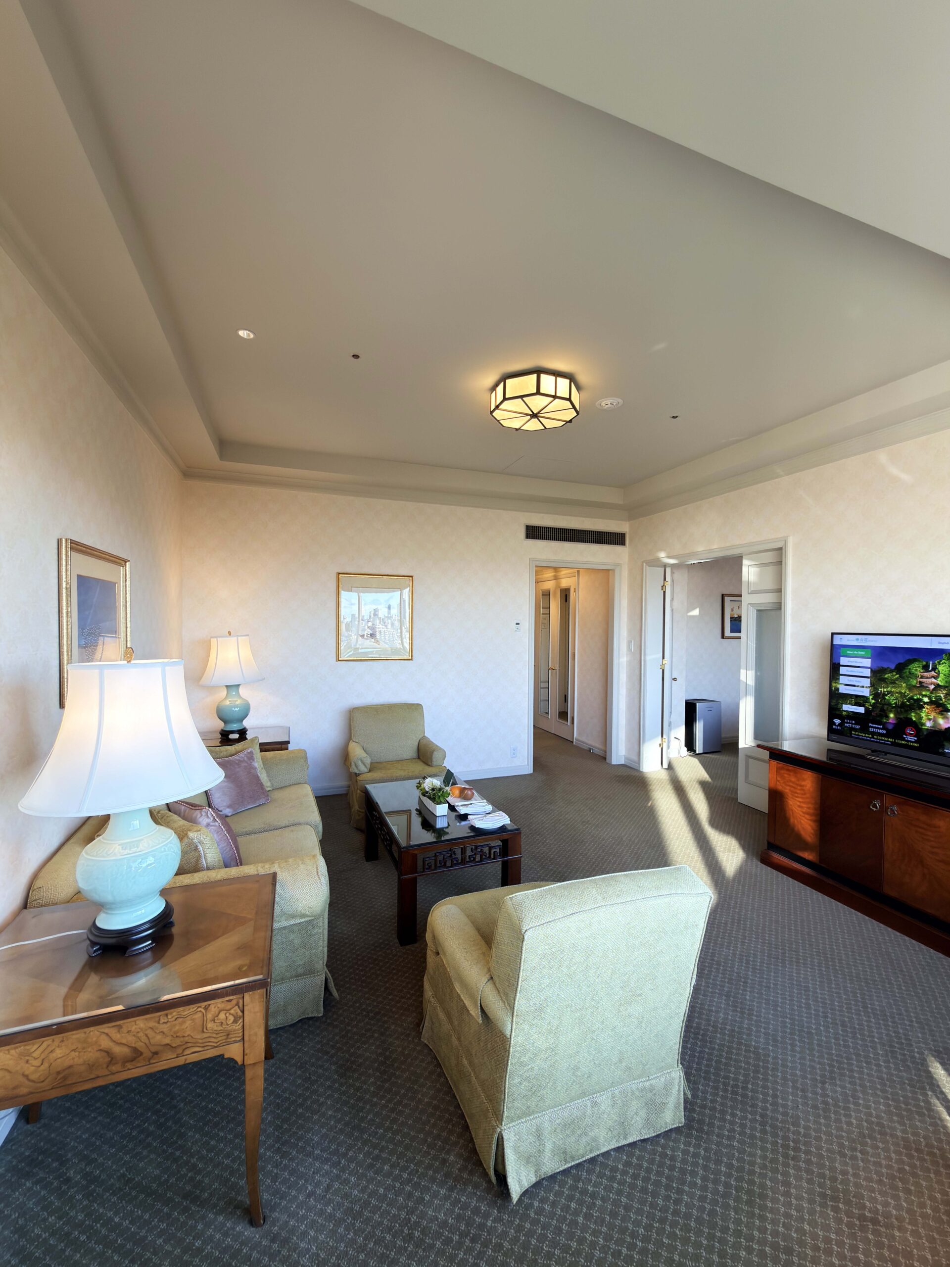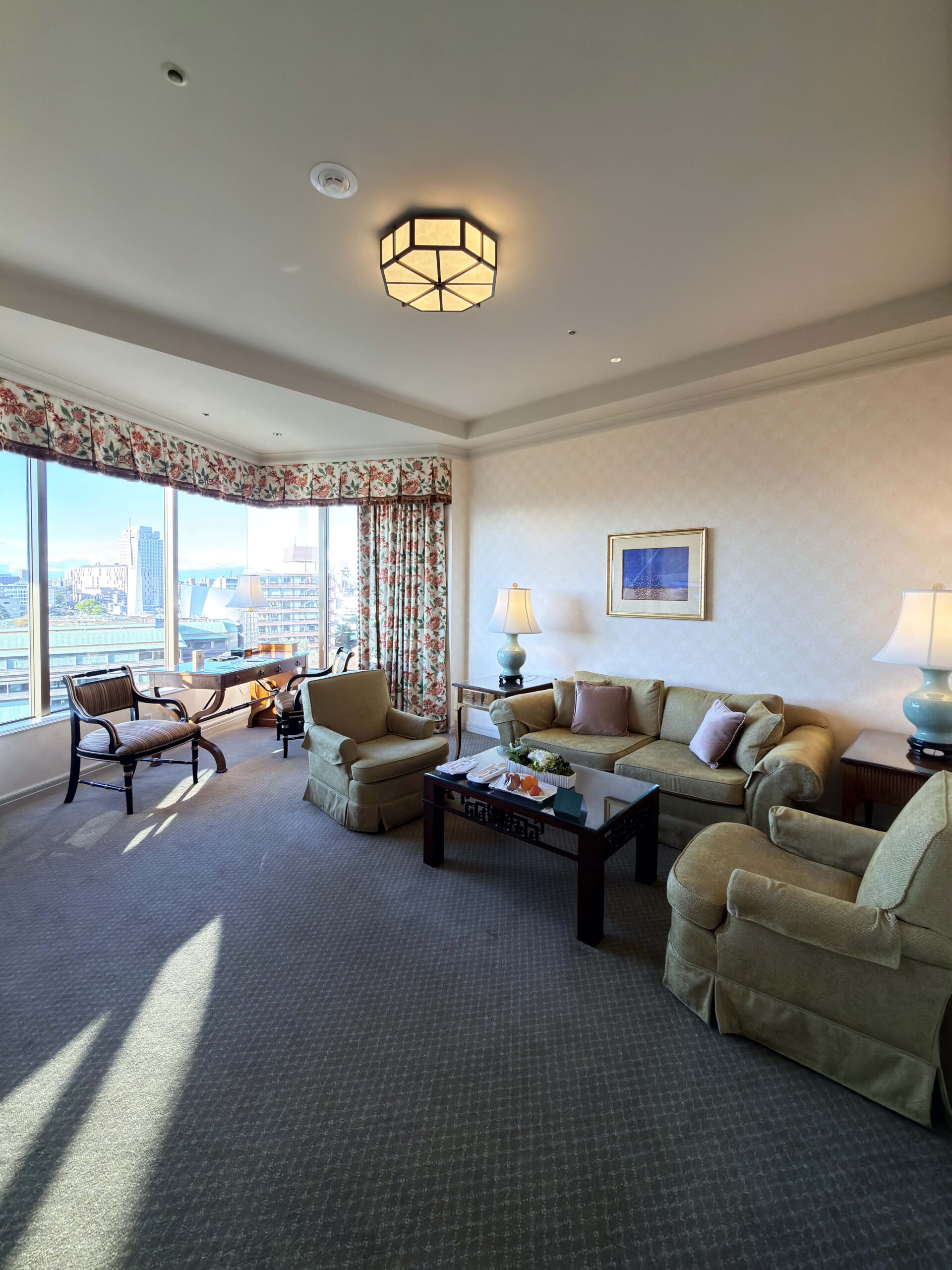 For this stay, I chose the 1 Bedroom Prime Suite (Corner), the exact same room type I loved during my last visit. Spanning a generous 60 m² (646 ft²), this suite is a masterclass in classic elegance. Being a corner unit on a higher floor, it offers a direct, panoramic view of the historic Chinzanso Garden. The layout features a separate, spacious living room for lounging and a tranquil bedroom for rest. The bathroom is equally luxurious, boasting a separate bathtub and shower, double vanities for ample space, and the softest robes and slippers that make “staying in” feel like a true event.