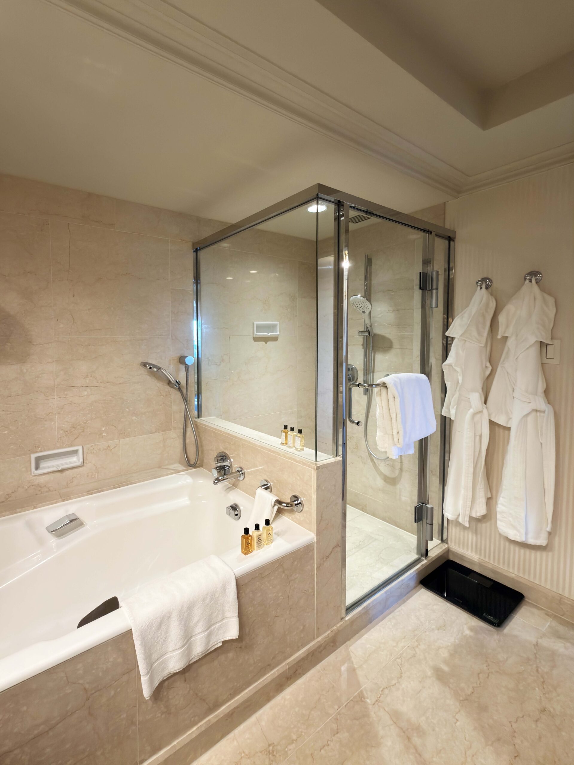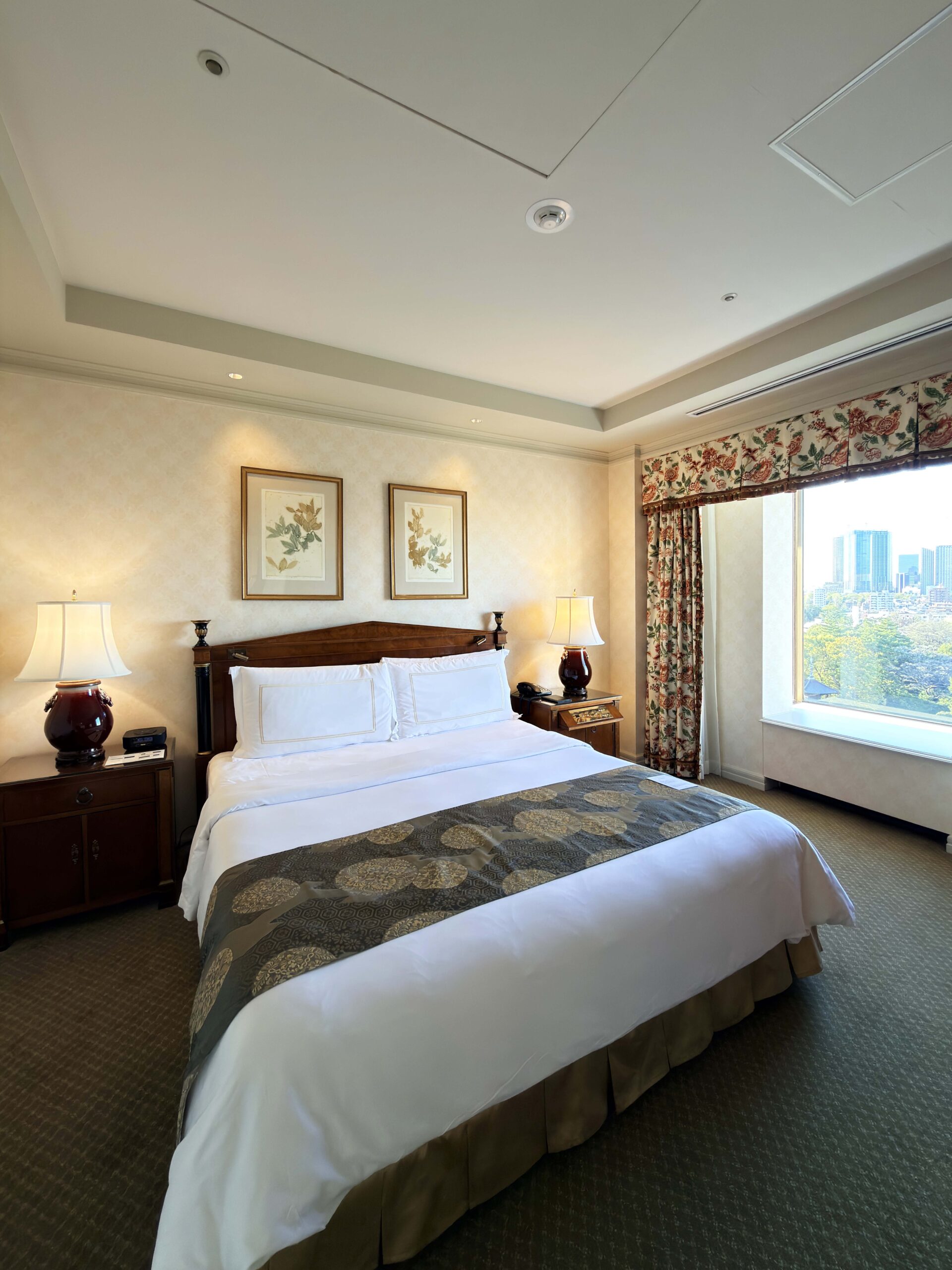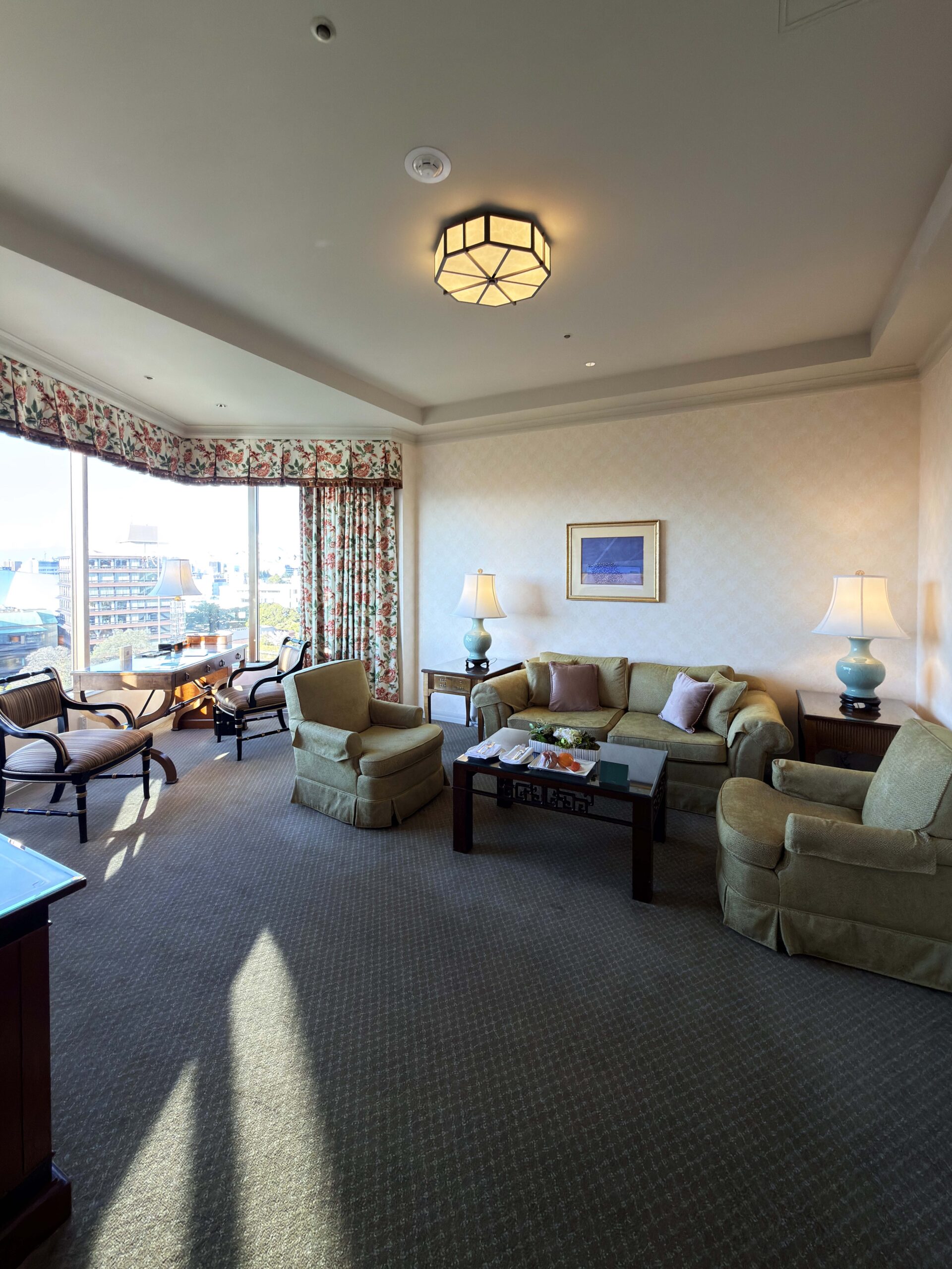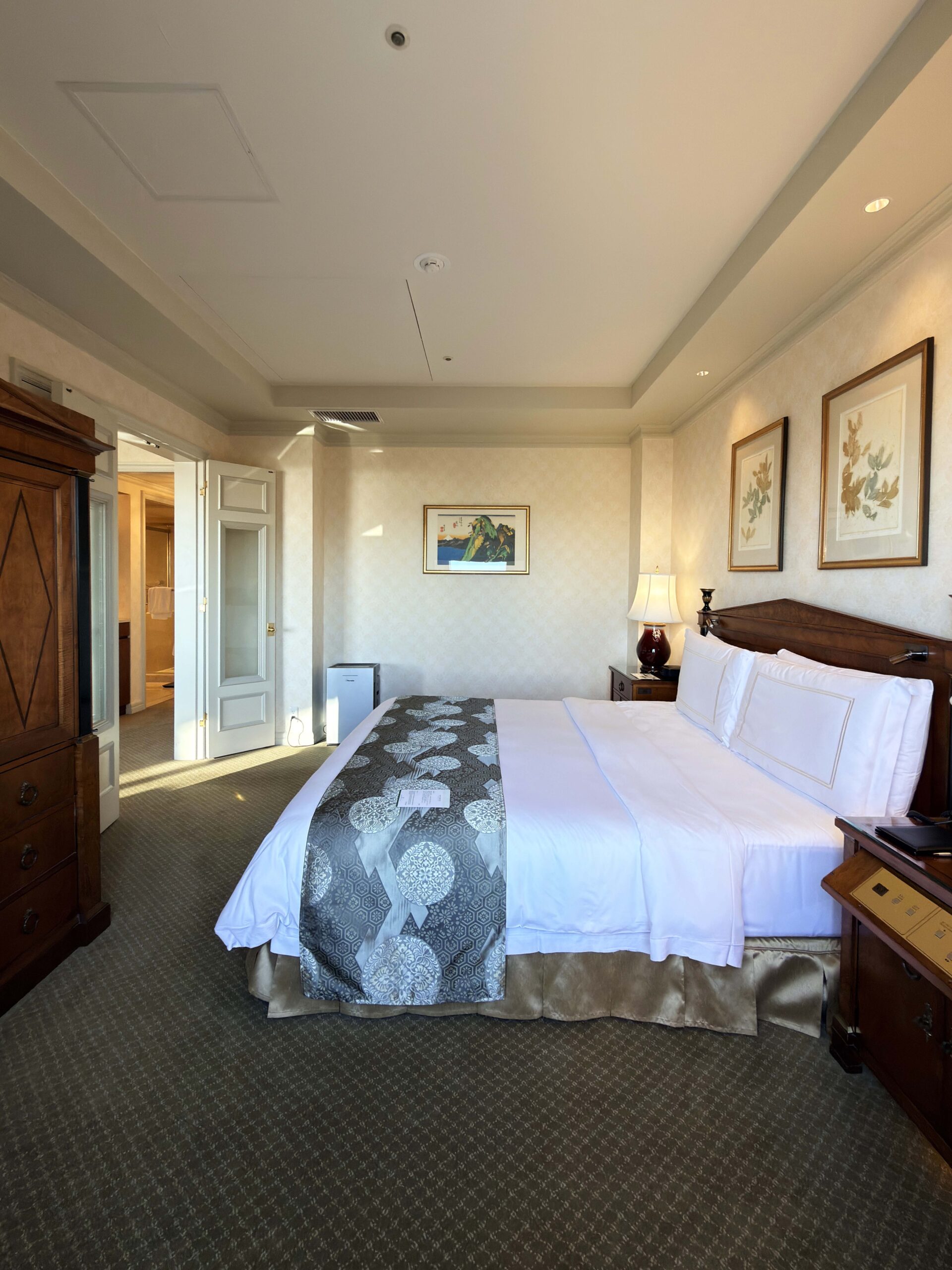 For this stay, I chose the 1 Bedroom Prime Suite (Corner), the exact same room type I loved during my last visit. Spanning a generous 60 m² (646 ft²), this suite is a masterclass in classic elegance. Being a corner unit on a higher floor, it offers a direct, panoramic view of the historic Chinzanso Garden. The layout features a separate, spacious living room for lounging and a tranquil bedroom for rest. The bathroom is equally luxurious, boasting a separate bathtub and shower, double vanities for ample space, and the softest robes and slippers that make “staying in” feel like a true event.