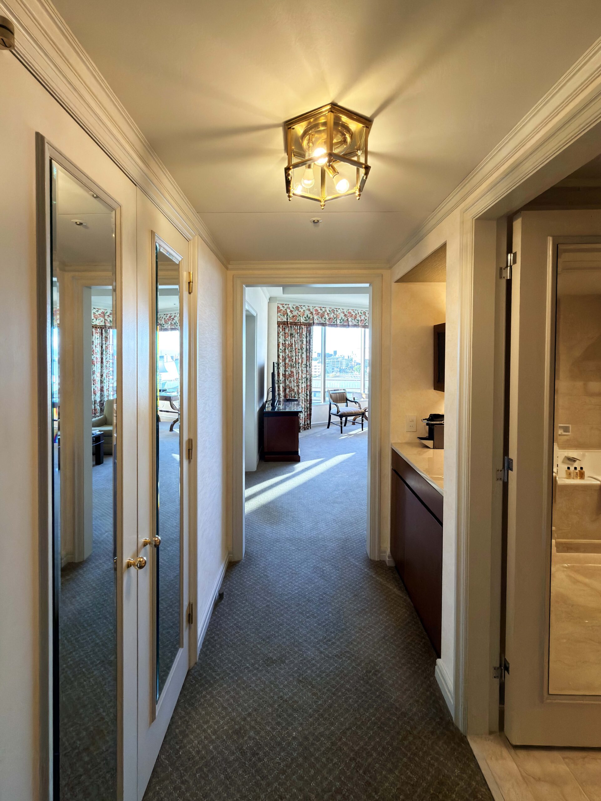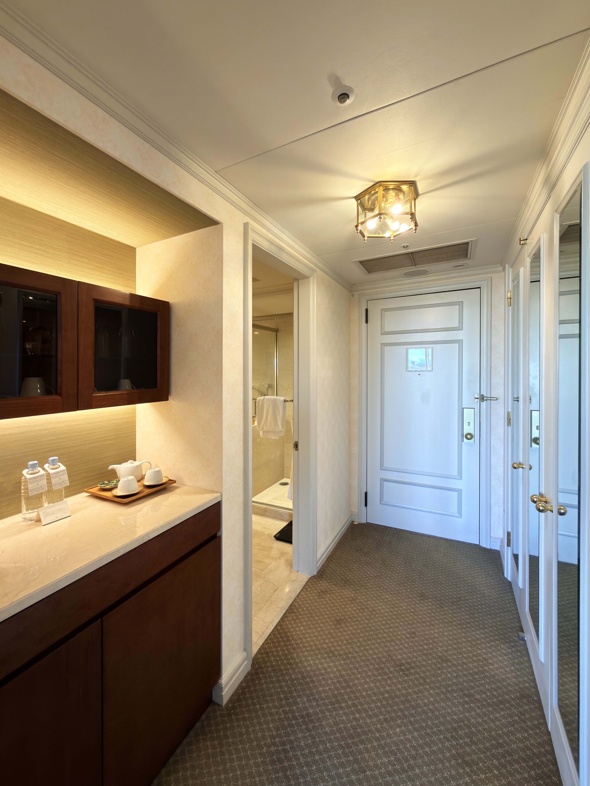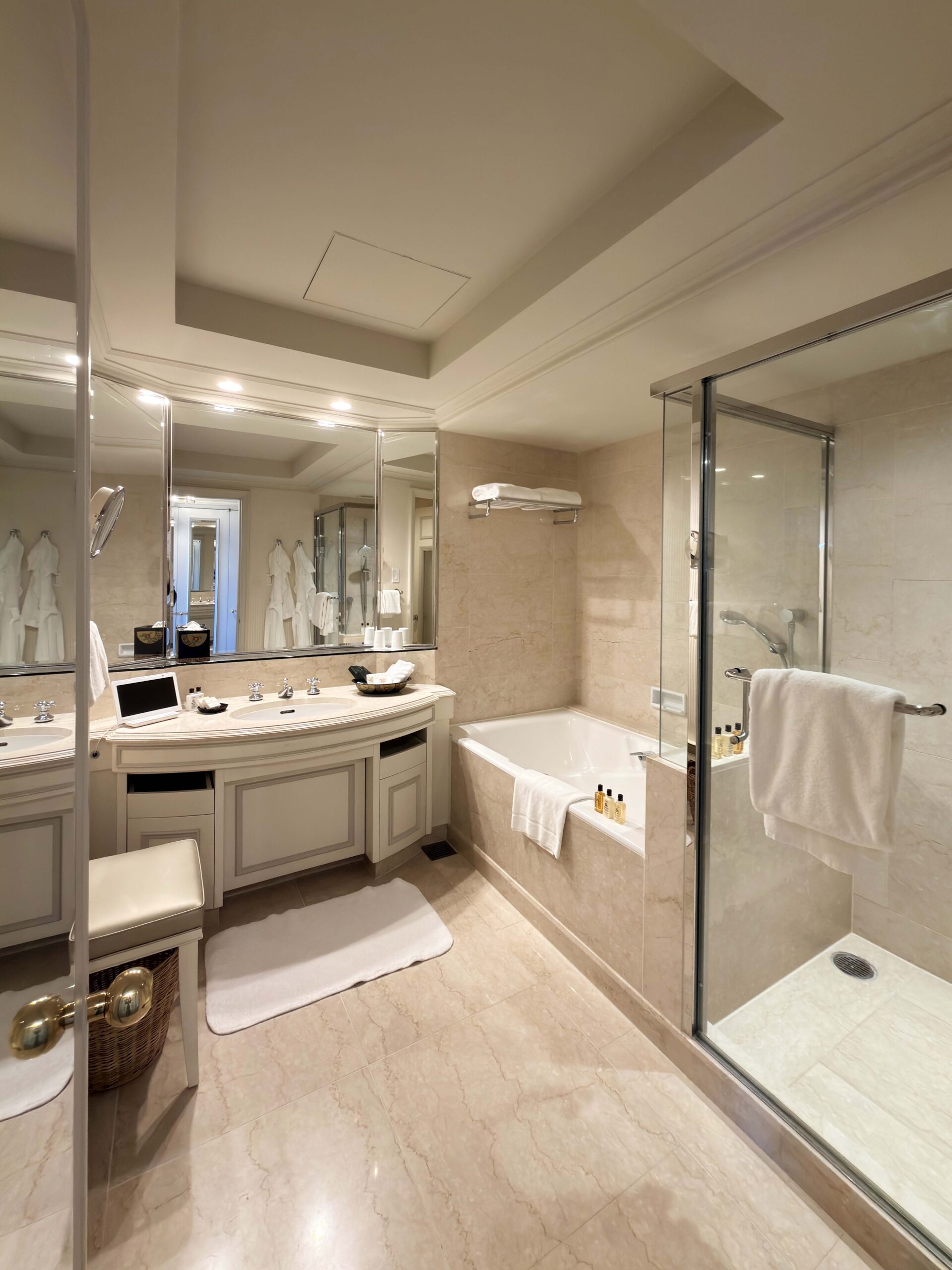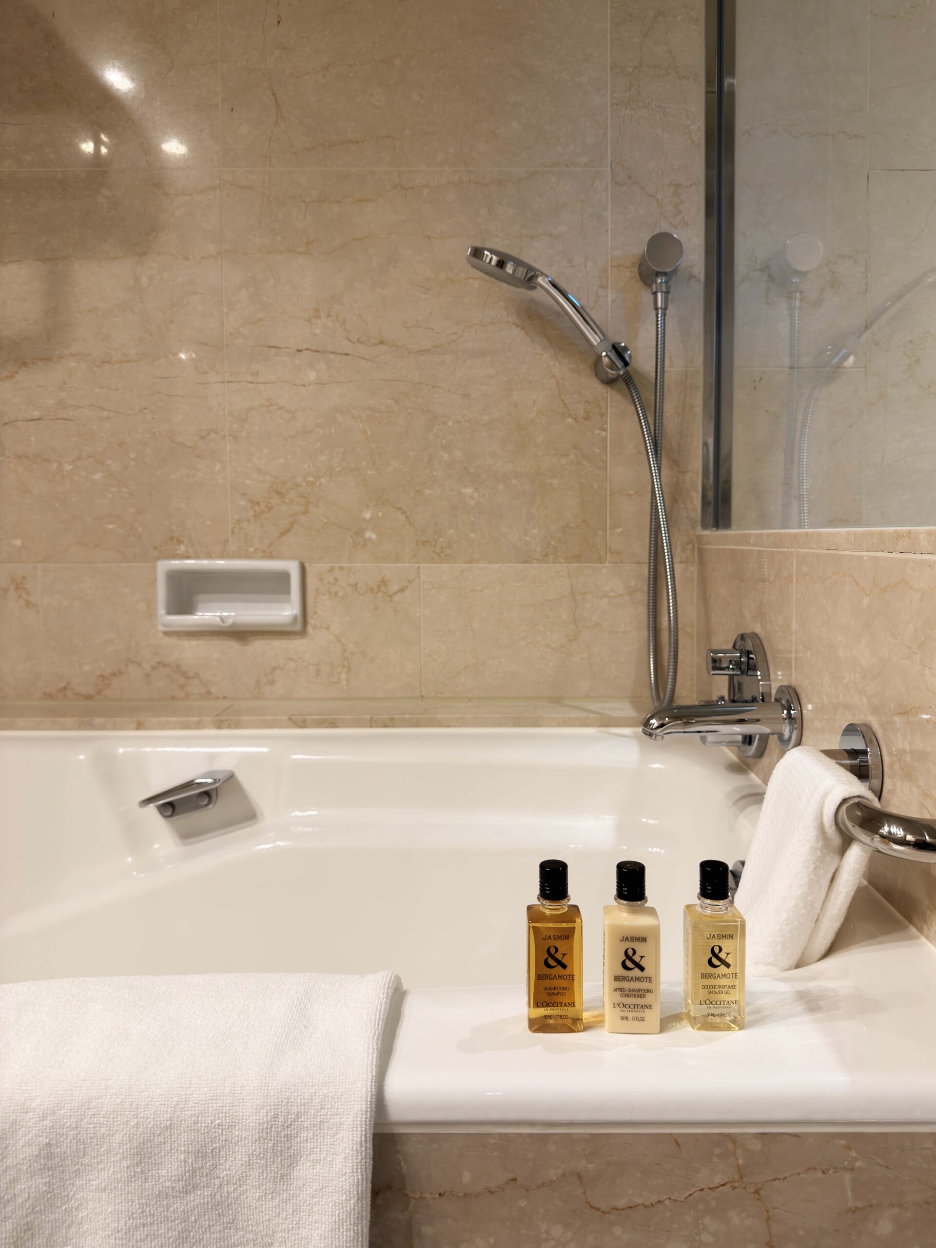 For this stay, I chose the 1 Bedroom Prime Suite (Corner), the exact same room type I loved during my last visit. Spanning a generous 60 m² (646 ft²), this suite is a masterclass in classic elegance. Being a corner unit on a higher floor, it offers a direct, panoramic view of the historic Chinzanso Garden. The layout features a separate, spacious living room for lounging and a tranquil bedroom for rest. The bathroom is equally luxurious, boasting a separate bathtub and shower, double vanities for ample space, and the softest robes and slippers that make “staying in” feel like a true event.