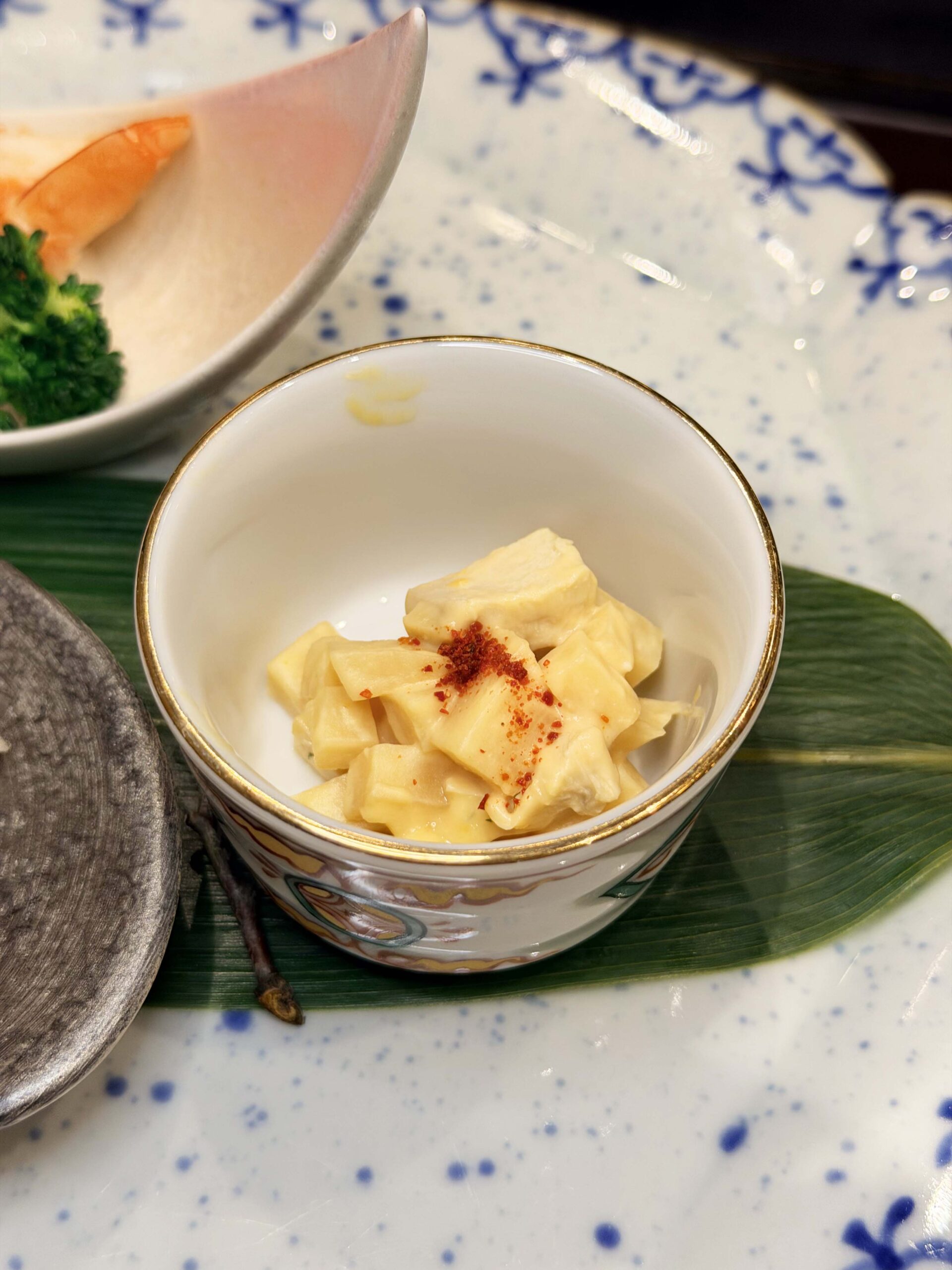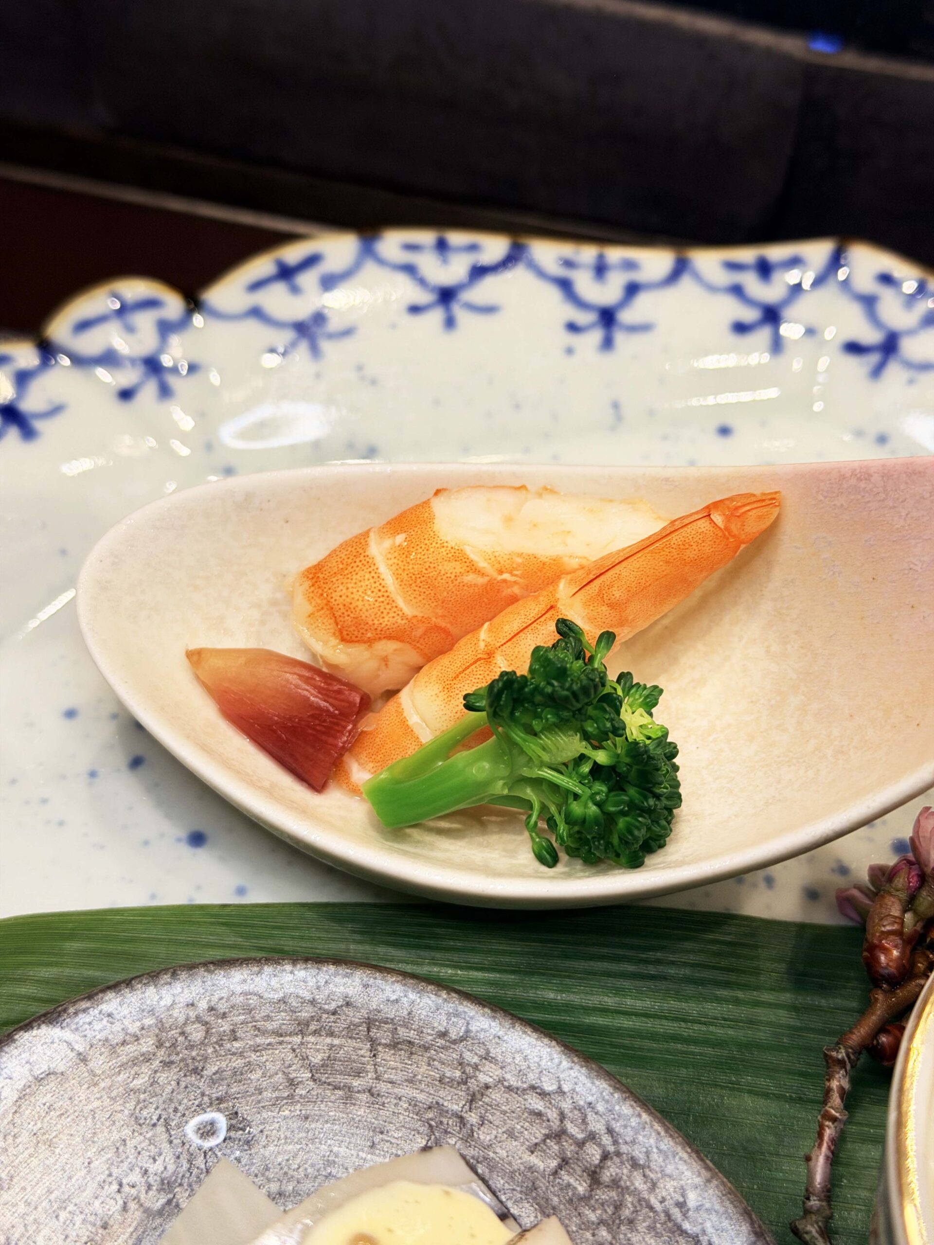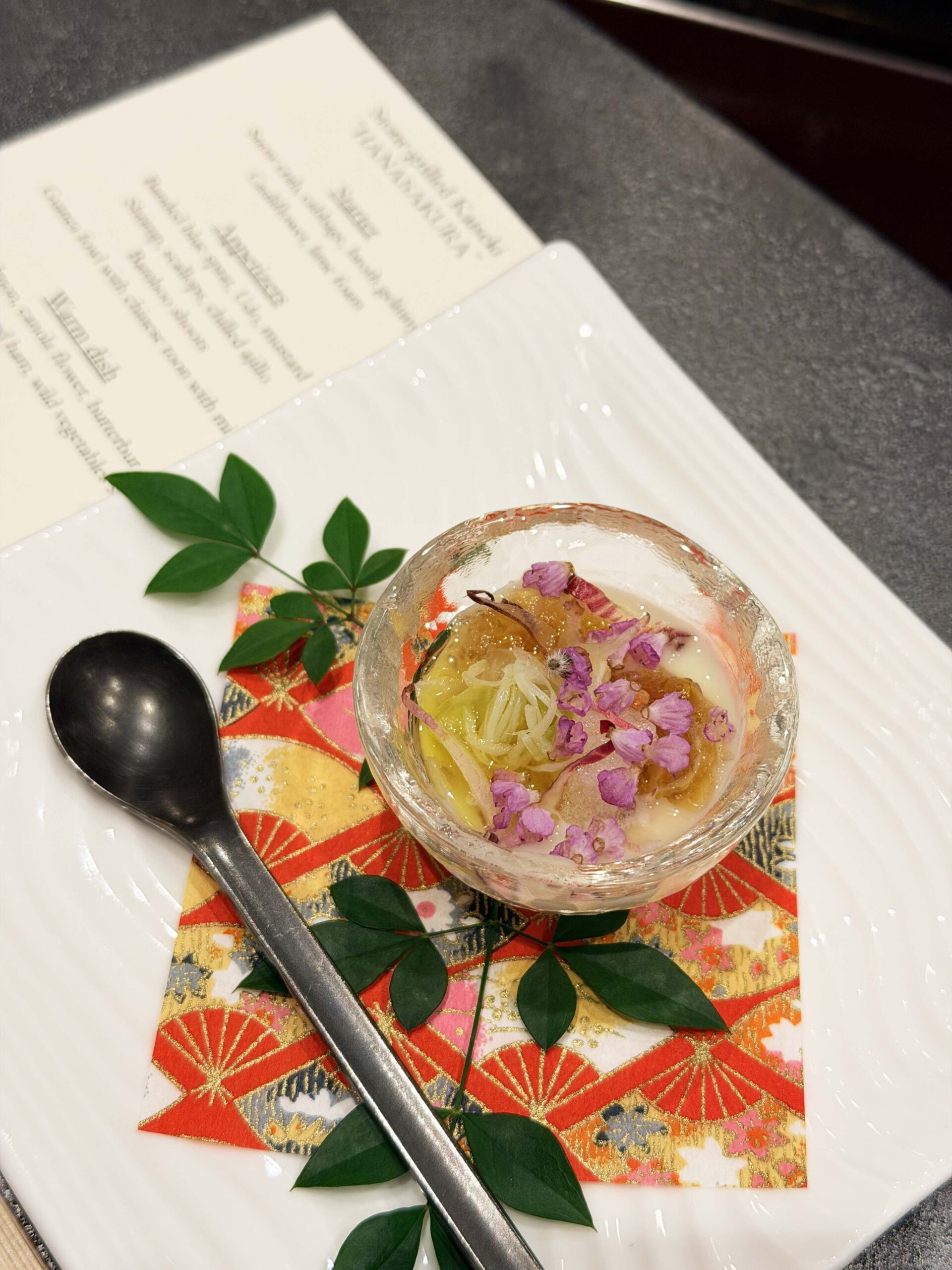 For dinner, I experienced the exquisite ‘HANASAKURA’ Menu. Each course was a celebration of spring’s bounty, beginning with a starter of snow crab and cabbage enveloped in a delicate broth gelatin, topped with cauliflower and a bright lime foam. The appetizers followed in a beautiful procession: banded blue sprat with Udo and mustard, a chilled ajillo of shrimp and scallops, tender bamboo shoots, and guinea fowl paired with Chinese toon and savoury miso.
