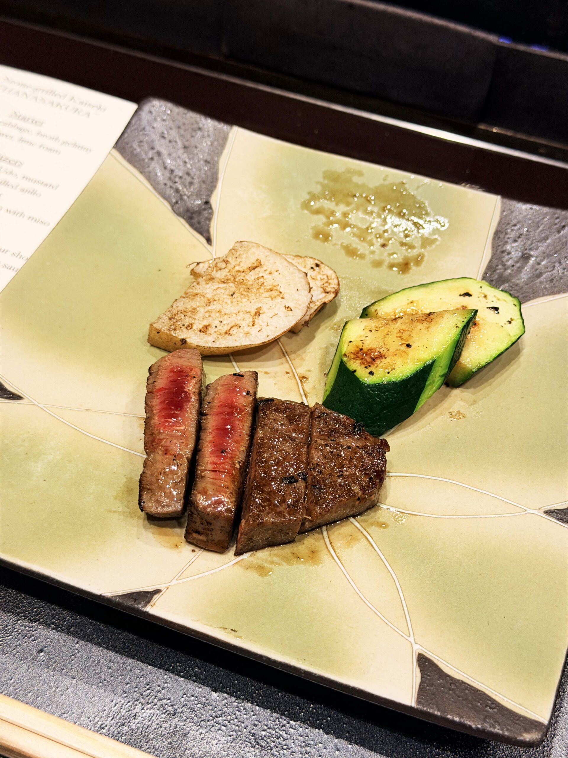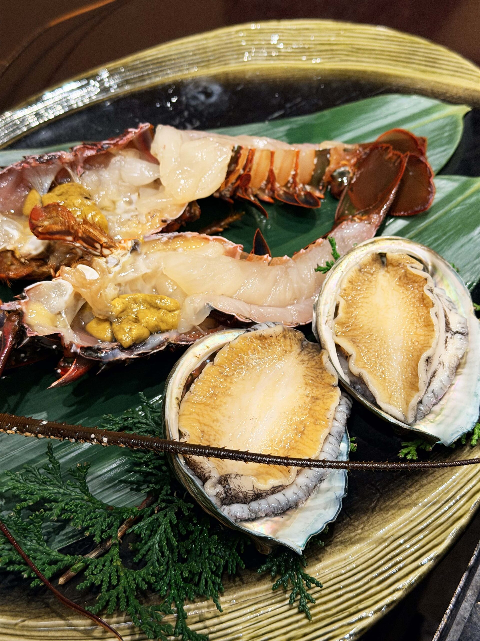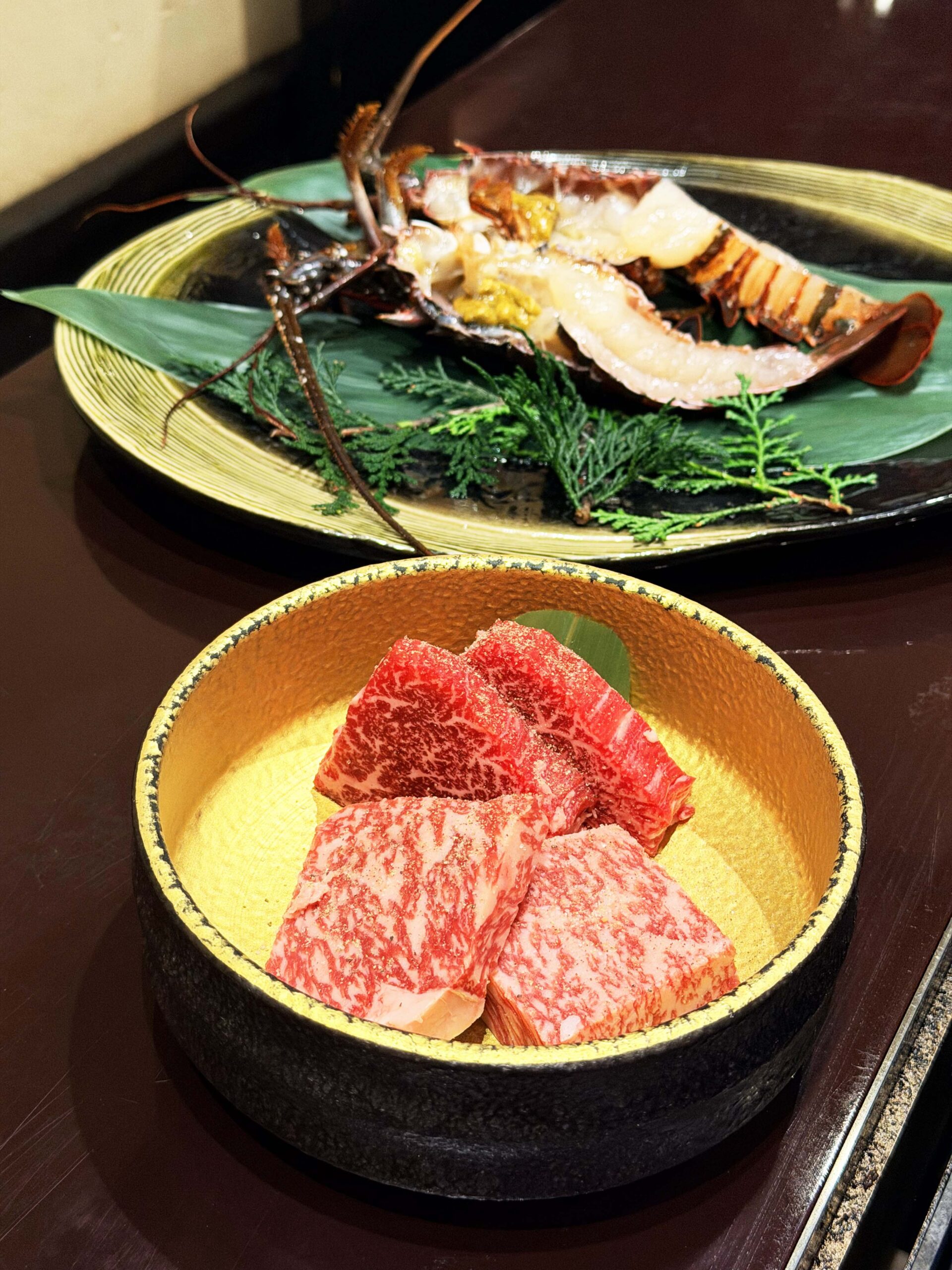 Then came the main event: the Stone Grill. I watched in awe as abalone, Japanese spiny lobster, and two cuts of Kuroge Wagyu beef—the loin and the fillet—were seared to perfection alongside three kinds of seasonal vegetables. The meal concluded with a comforting rice set featuring seasoned rice with clam and octopus, ginger, and ciboulette, served with miso soup and pickles.
