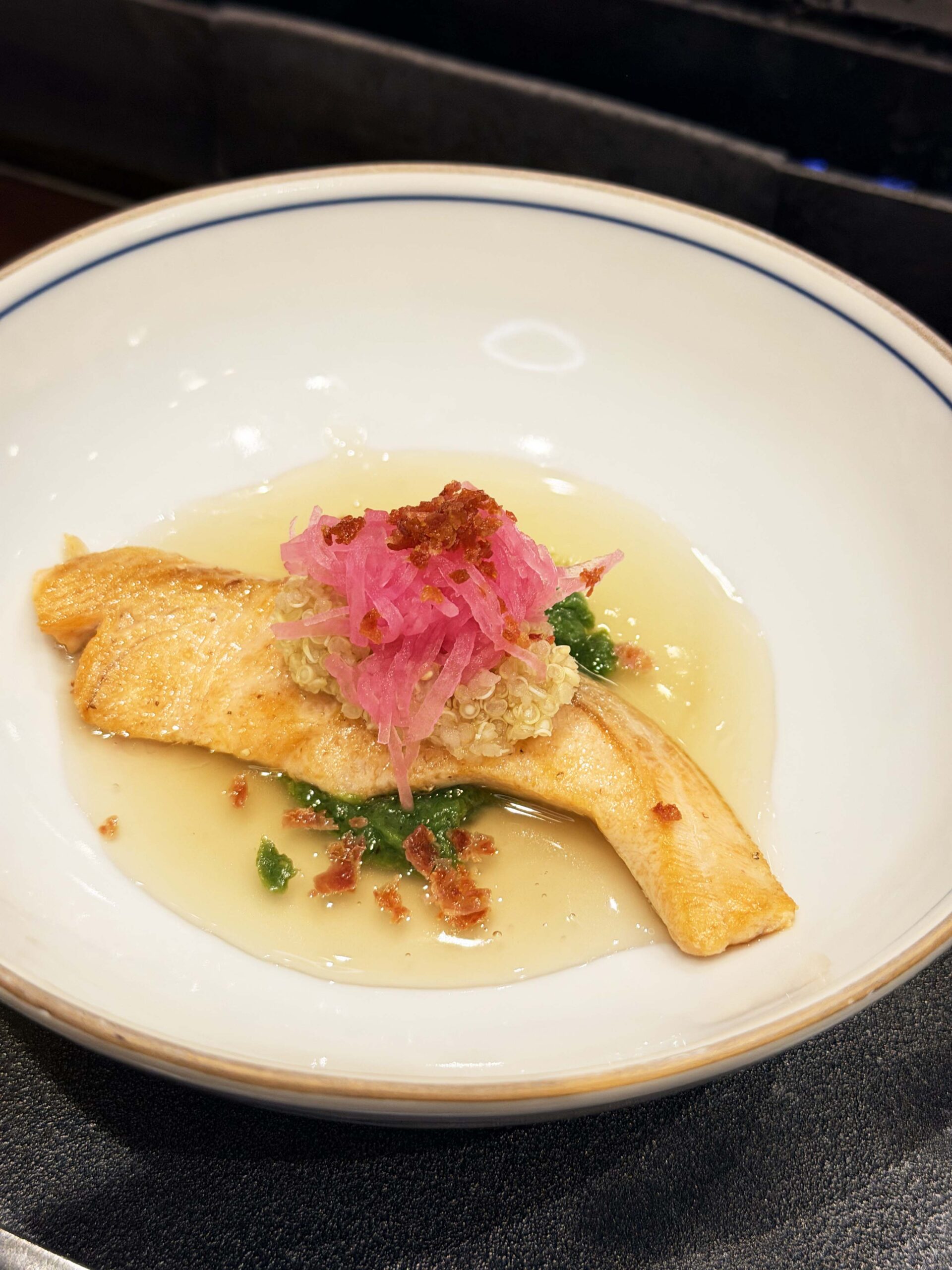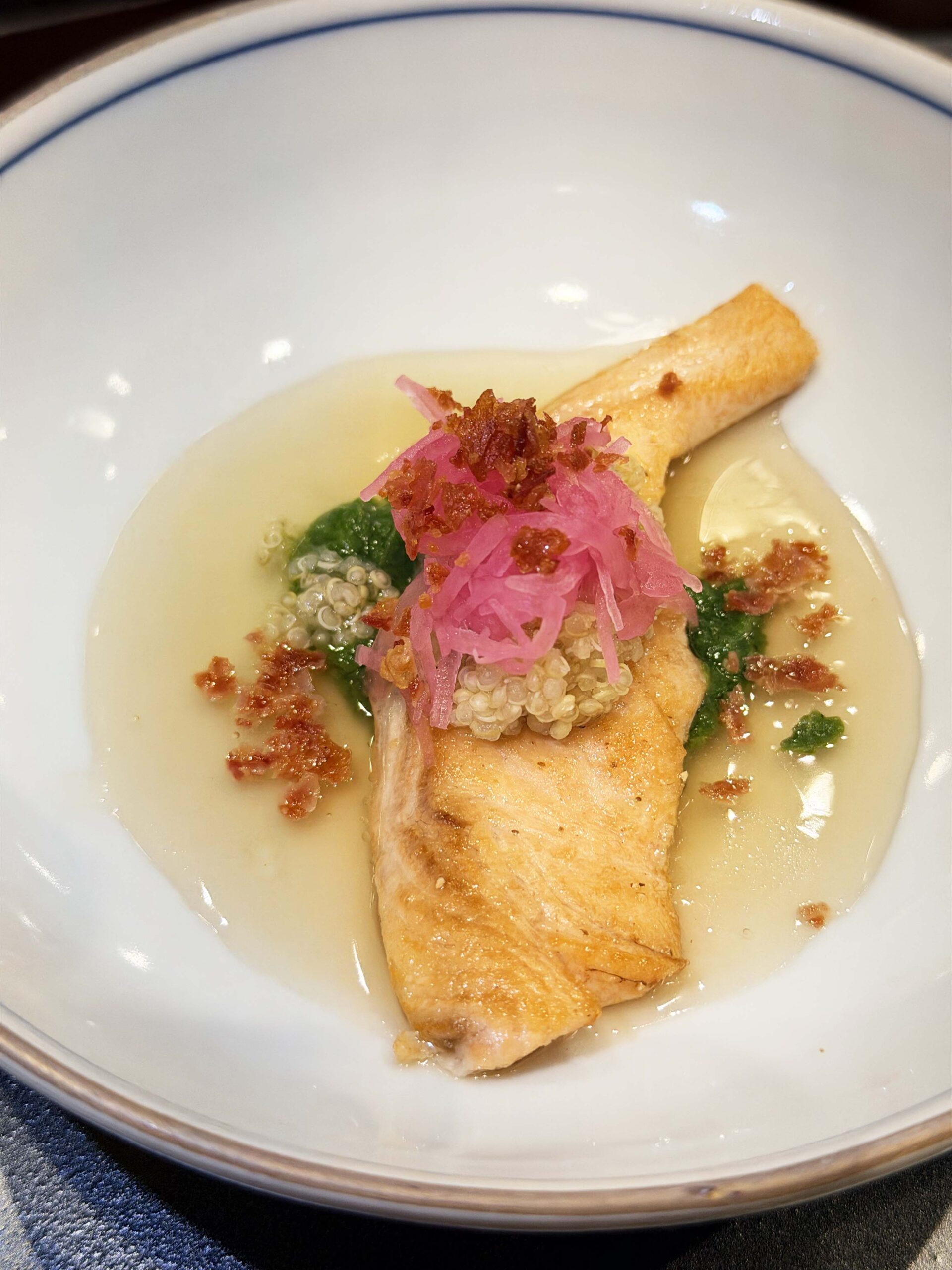 The warm dish was a highlight—succulent cherry salmon served with canola flower and butterbur shoot, accompanied by quinoa and a wild vegetable sauce with a hint of dry-cured ham.