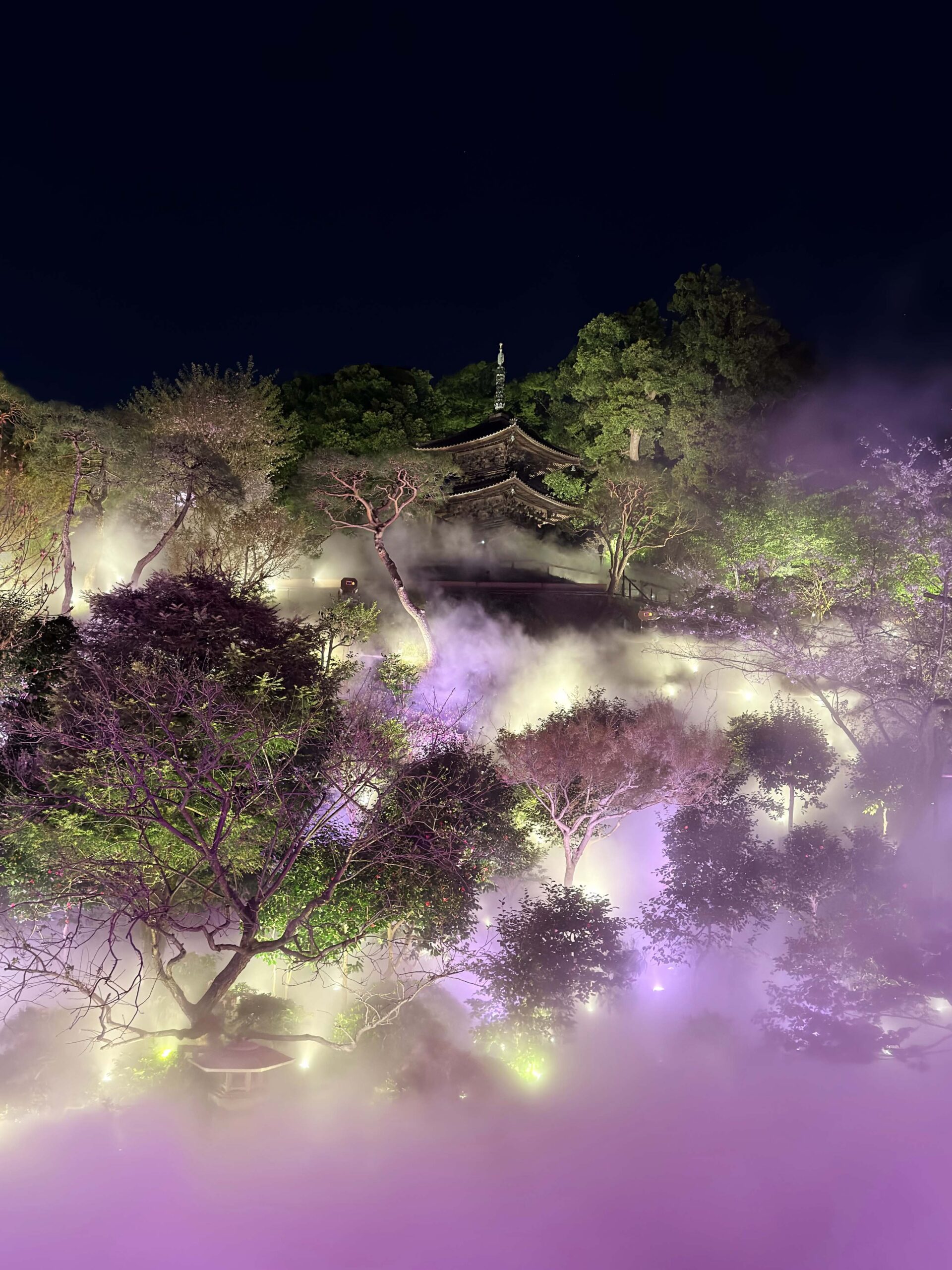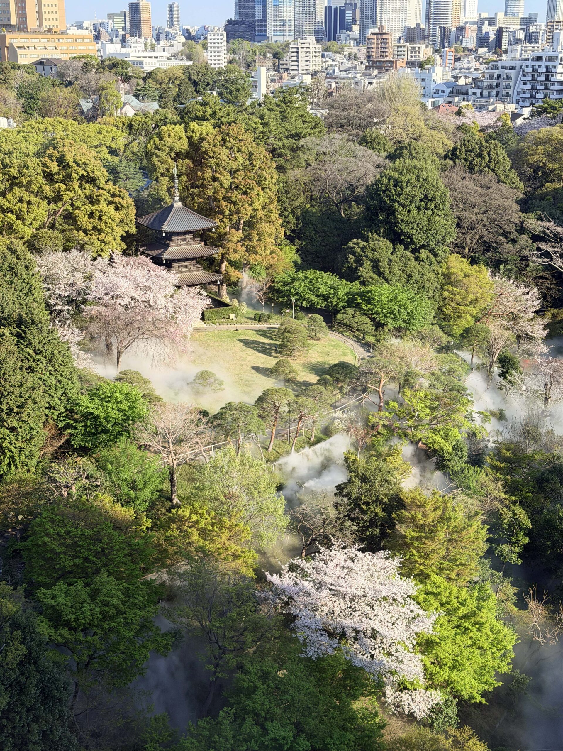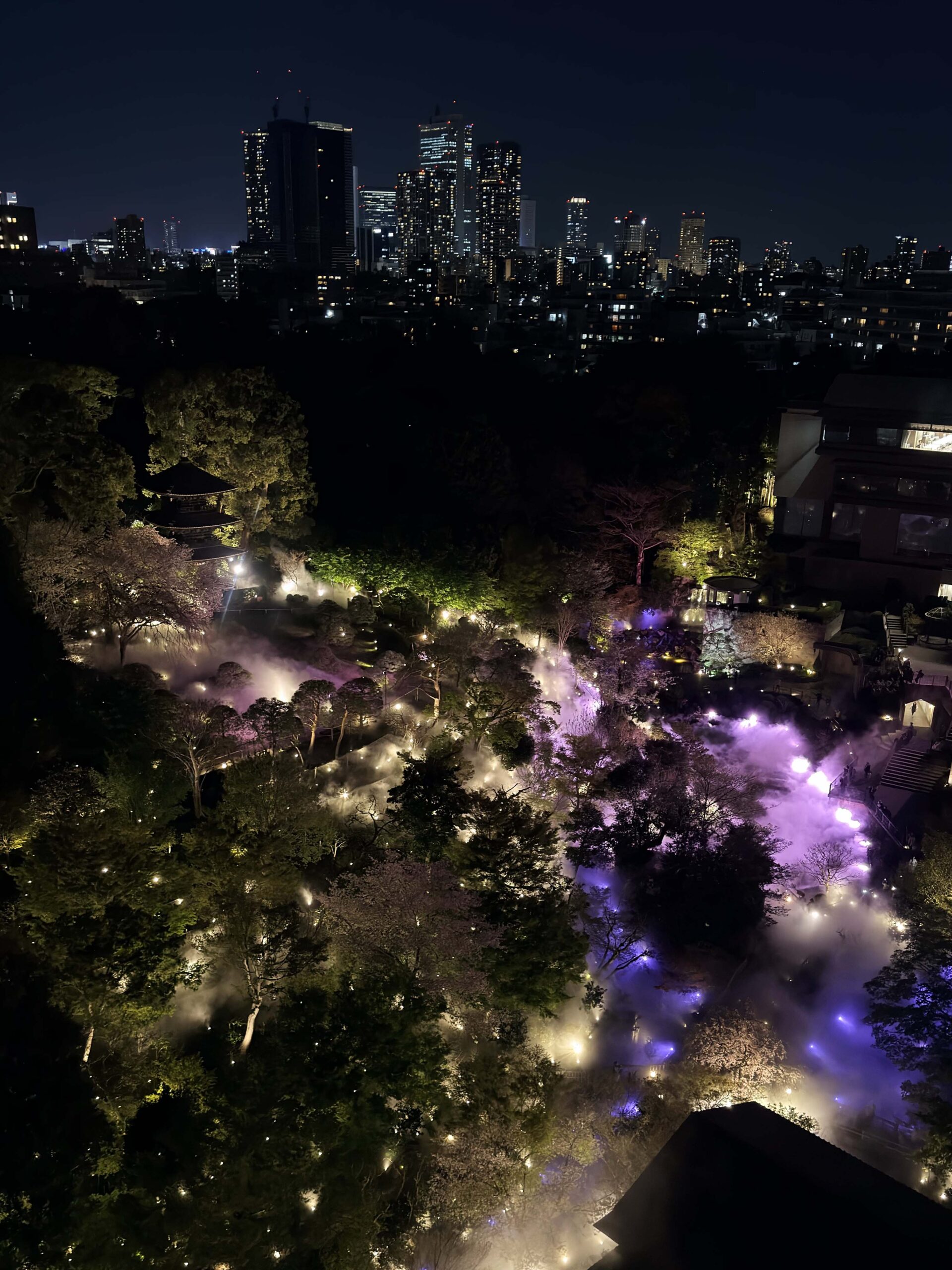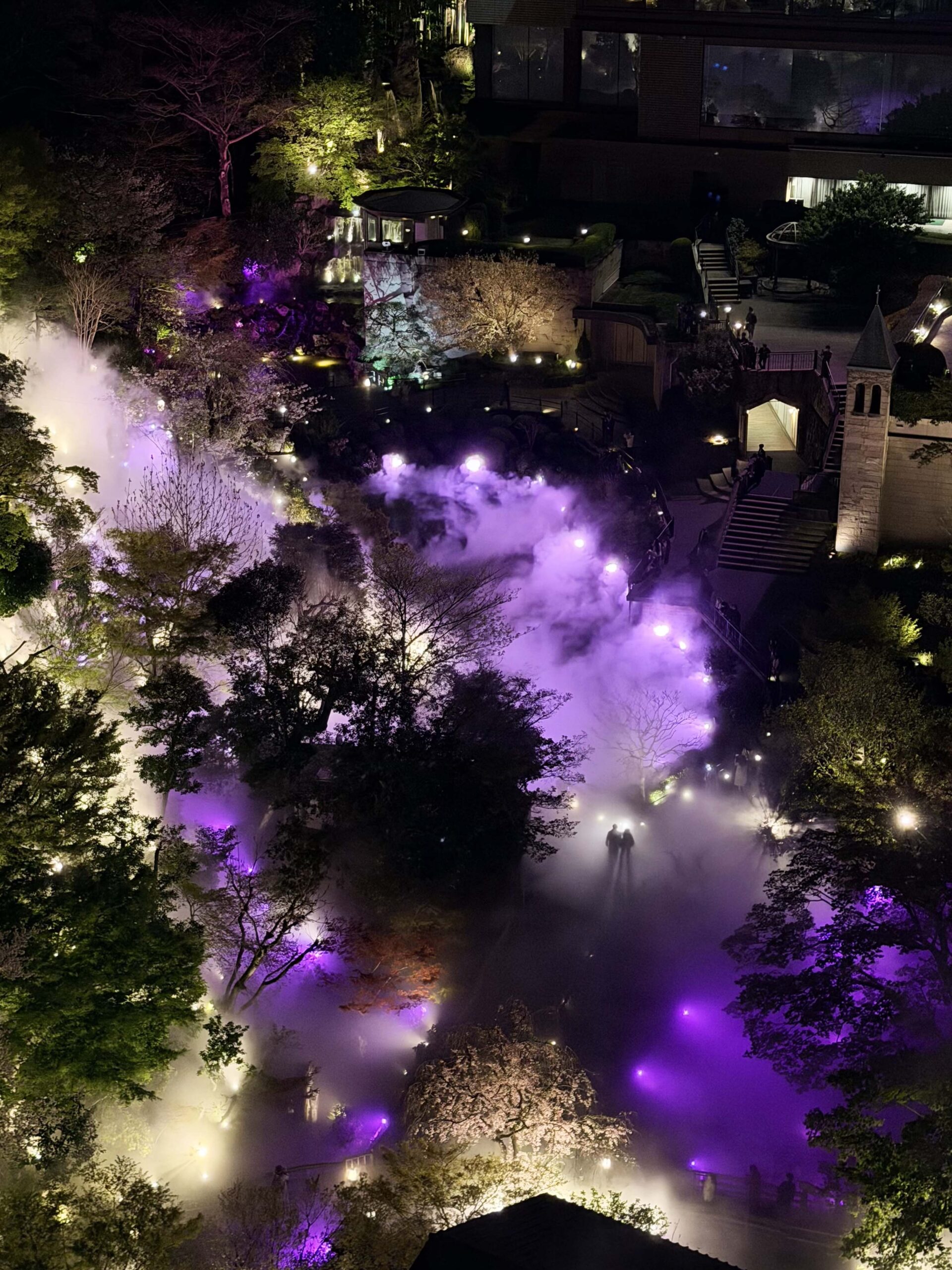 The tranquil Chinzanso Garden is a historical treasure, home to over 100 cherry trees. However, what truly sets this hotel apart during Hanami is the Sakura Sea of Clouds. This is a special nighttime iteration of their famous Tokyo Sea of Clouds. After sunset, a veil of light-pink mist begins to rise over the garden, perfectly evoking the delicate hue of the cherry blossoms. When combined with the soft, strategic glow of 10,000 hidden lights, it creates an otherworldly, ethereal atmosphere. Walking through the pink fog felt like stepping into a dream, capturing the fleeting, fragile magic of the season in a way no other place in Tokyo can.